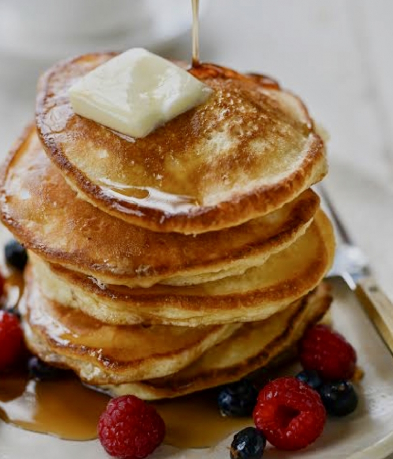 Pancakes A stack of 4 pancakes served with berries and pure maple syrup,dusted with icing sugar $18 per serve