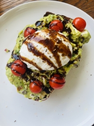 Smashed Avocado Avocado, red onion, lemon juice, tomato & coriander on sourdough with poached egg,cooked to your liking,drizzled with fig glaze $18 per serve